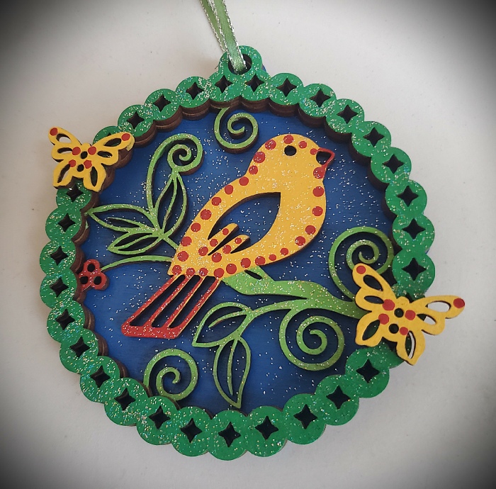 Have fun designing a beautiful a keepsake with this “Bird” layered decoration! Made from high-quality wood, each piece features an intricate laser cut four layer design that come ready for you to paint. Step by step instructions will allow you to customize each wooden layer with a variety of superimposed colors, textures and glitter paint on all layers for a finished brilliant effect. Perfect for a gift or home decor, this unique ornament allows your creativity to shine! Each attendee will take home their finished 3.50” ornament (including the butterflies, which are optional) complete with a colorful ribbon for hanging.